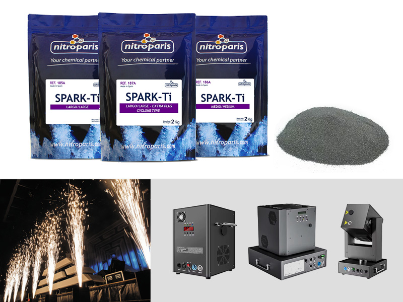 SPARK-Ti, consumible de gran calidad, en formato polvo/granulado, basado en una aleación de titanio, especial para utilizar en máquinas de fuego frío como pirotecnia de interior y generar efectos especiales de fuego y chispas en eventos y espectáculos. Es totalmente inocuo, No quema, No necesita ninguna licencia, No es composición pirotécnica. El consumible SPARK-Ti es compatible con todo tipo de máquinas de fuego frío/chispas, como por ejemplo la máquina de chispas Sparkular. Está disponible en varias referencias dependiendo de altura de fuente de chispas : MEDIO: 3/5 m, LARGO 4/6 m y LARGO Extra Plus 8/10m. El polvo de titanio para chispas SPARK-Ti, se comercializa en bolsa de 2 Kg con auto-cierre para su perfecto almacenamiento y conservación.